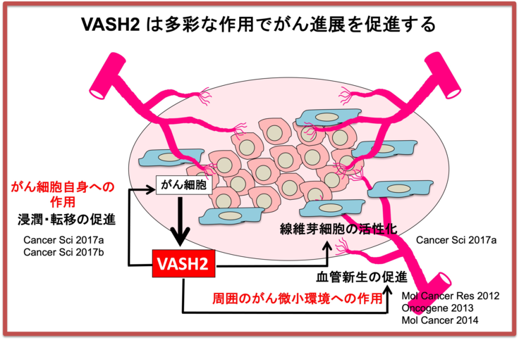 私のグループでは、VASH2はがん細胞自身に作用して浸潤・転移を促進するだけでなく、がん間質での血管新生の促進や線維芽細胞の活性化など多彩な作用でがん進展に関わっており、VASH2の作用を阻害することで著しい抗腫瘍効果が得られることを肝がん、卵巣がん、大腸がん、胃がんなどのモデルで明らかにしてきました。