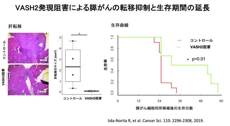 そこで膵がんのマウスモデルを用いて検討した結果、VASH2を阻害することで、膵がんの進展、とりわけ転移が顕著に抑制され、VASH2だけを阻害することで生存期間を約2倍に延長することができたのです。*3