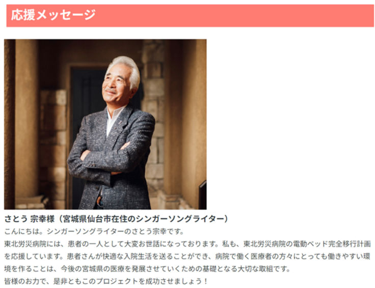 メジャーデビュー曲『青葉城恋唄』で全国に知れ渡り、以後40年以上仙台のトップスターとして君臨し続けているさとう宗幸様から、当プロジェクトに応援メッセージをいただきました。(本サイトのトップページをご覧ください)