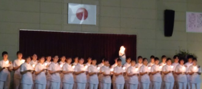 今年看護学校に入学した1年生29名は、ナイチンゲール像から受け継いだ灯火を手に『ナイチンゲール誓詞』を諳んじ、「わが任務を忠実に尽くさんこと」を神に誓いました。