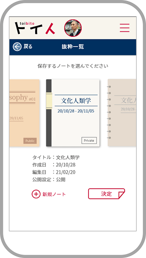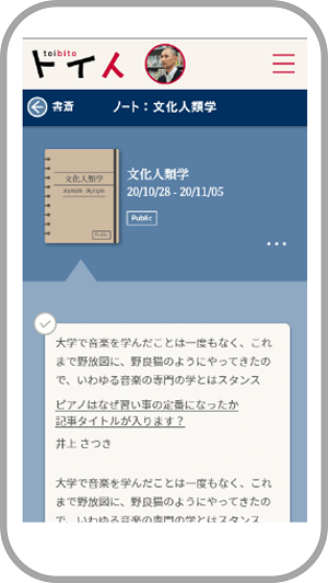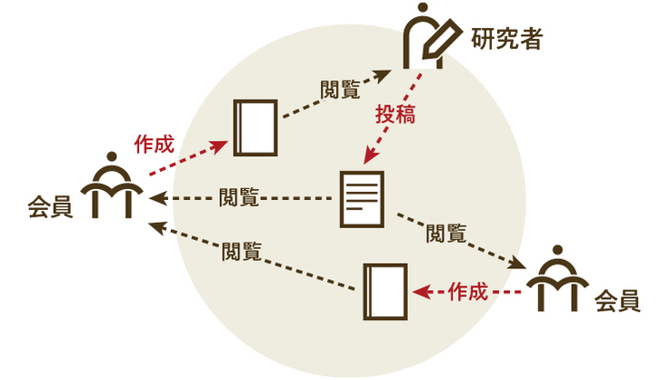 研究者が自身の研究を紹介する記事(コラム・エッセイ・ゼミの活動報告等)を投稿。読者がその記事の任意の箇所を「抜粋」してノートを作成・公開することにより、情報が共有され、同時にユーザー間のつながりが生まれます。