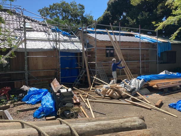 建物本体の匠の技による修築が進み、新たにユニバーサルトイレや男女トイレスペースの設置、文化財の母屋の塗装開始。写真は、中庭から見た原田邸の裏側の様子で、大規模に修築が進んでいます。左手が母屋、右手がユニバーサルトイレが入る離れです。