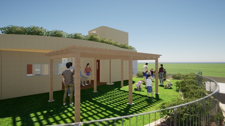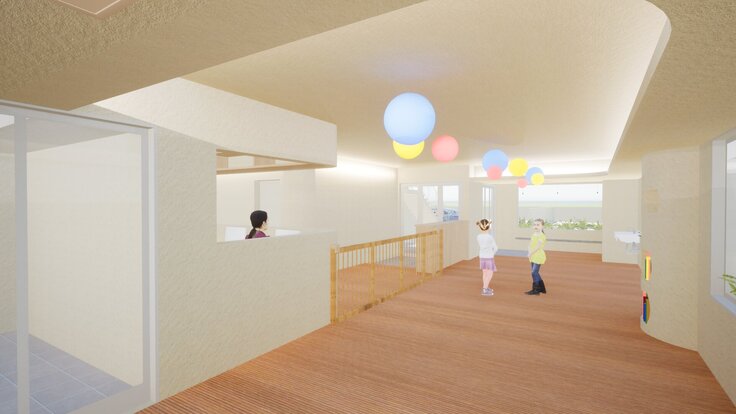 地域の子どもたちが医療ケアを必要とする子どもの存在や、その暮らしについて理解し、共に地域で暮らす仲間として、出逢い、ふれあい、考えることができるような場所が必要だと考え「屋上園庭(集える空間)」を計画しました。屋上庭園の豊富な草花や菜園が周囲に彩を与え、子どもたちの笑顔や楽し気な声が聞こえる地域のオアシスとなるでしょう。