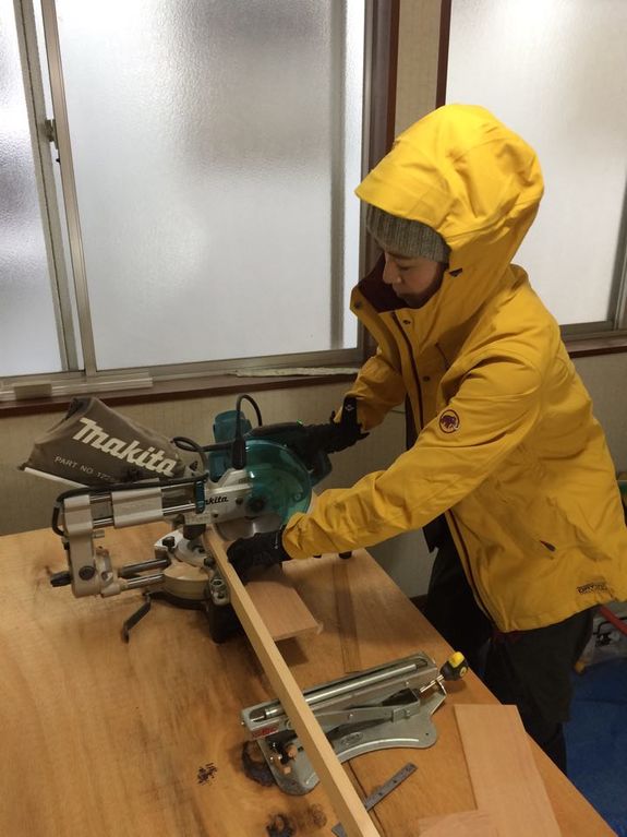 (板をちょうどいい大きさに切断する作業!恐る恐る・・・)
