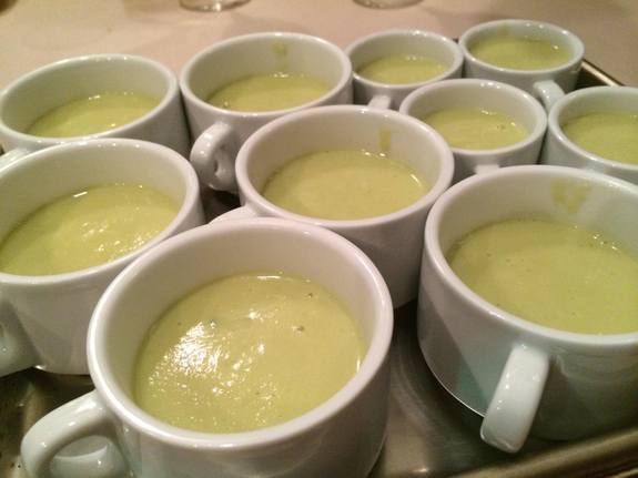 シェフに作り方をザックリと教えてもらったところ、妻有ポークのバラ肉の表面に焦げ目がつく程度にいため、そこに玉ねぎ・ニンジン・セロリ・水に浸していないサトイラズをそのまま入れて炒める。お肉を抜いて、野菜とサトイラズを2時間ほどじっくり煮込んだ後にミキサーにかけて、最後にお肉と水に浸しておいたサトイラズを一緒に入れて煮込む!味付けは塩とニンニクとスパイスのみ!野菜のうまみがしっかり出ていて、やさしいイタリアの家庭料理に変身です♪
