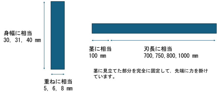 下図は,今回のシミュレーションで分析した物体の形状を示しています。長さは刃長,厚さは重ね,幅は身幅に対応しており,先端に約10kg(100N)の力を掛けた時の状態を分析しています。力の掛け方は,斬るを想定したものと側面(鎬側)で受けたときの2通りで分析しています。物体の強さは,日本刀の鎬や棟を想定した粘り強い状態とし(降伏応力572MPa,引張強さ696MPa),物体内部の強さは全て一緒となります。