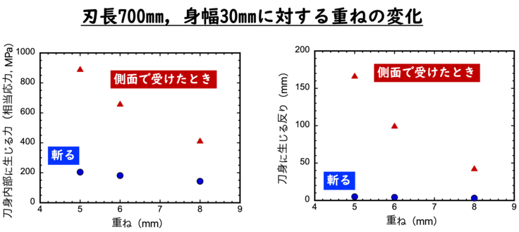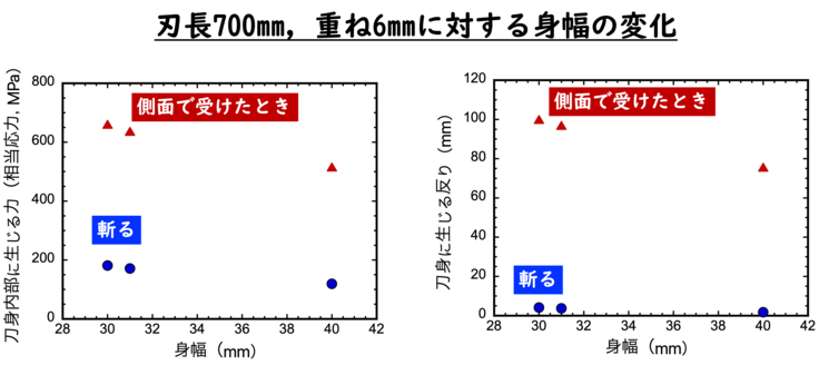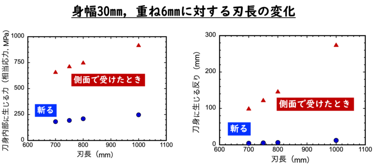 その他,刃長700mm,身幅30mm,重ね6mmを基準として,各寸法を変えた場合の分析結果をグラフに示します。