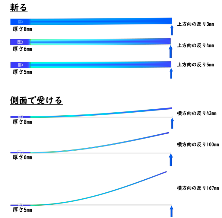分析の一例として,刃長700mm,身幅30mmの時に重ねを5mm,6mm,8mmにしたときの物体の変形図を示します。この図は色で物体内部に生じる負荷を示しており,青→緑→赤になるほど負荷が大きくなります。力は物体の先端に掛けていますが,物体内部で最も負荷が掛かるのは固定している部位との境界付近となります。斬るを模擬した場合,重ねが5mmだとしても上向きに生じる反りは僅かです。一方で,側面に力を掛けた場合は刀身は大きく反り,重ねが減少するに伴って反りは急激に増加しています。実際の日本刀は刃と棟側は薄くなっていますので,もっと曲がりやすくなると思われます。さらに,日本刀へと鍛え上げられた鋼は硬質なため,ここまで反ることなく折れてしまうでしょう。