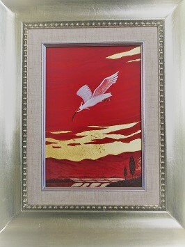 致します、私の好きな夕景です、佐渡の夕景を朱に染まる大空を舞うトキの小品