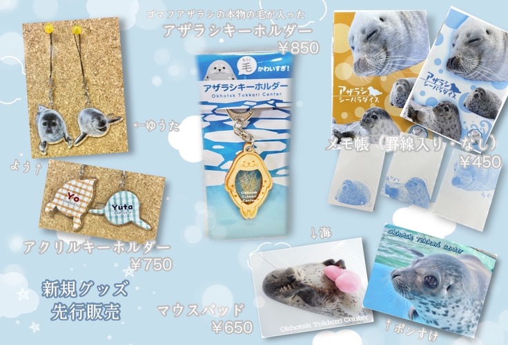 シーパラダイス3頭のメモ帳2種、毛入りアザラシキーホルダーです👏✨