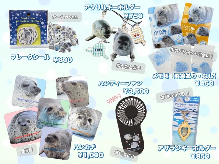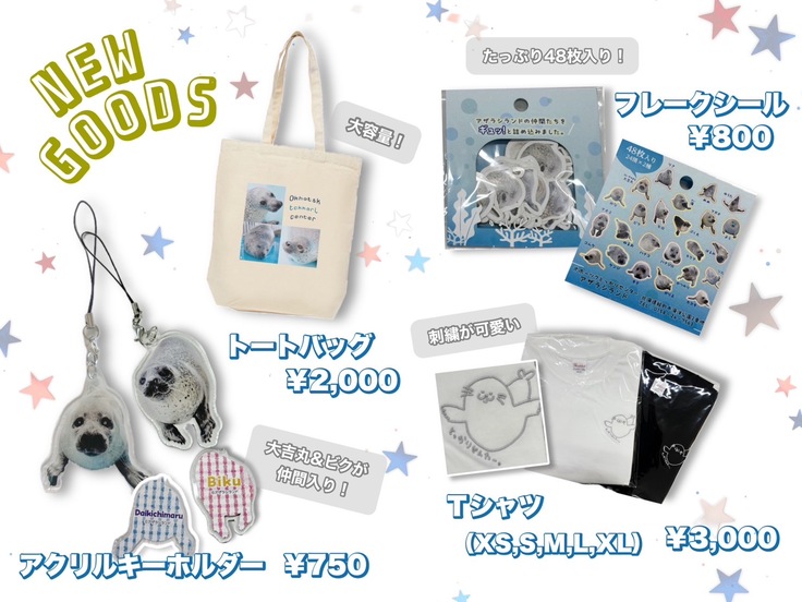 新グッズはアザラシランドからTシャツ、フレークシール、アクリルキーホルダー(大吉丸&ビク)、トートバッグが販売されます!