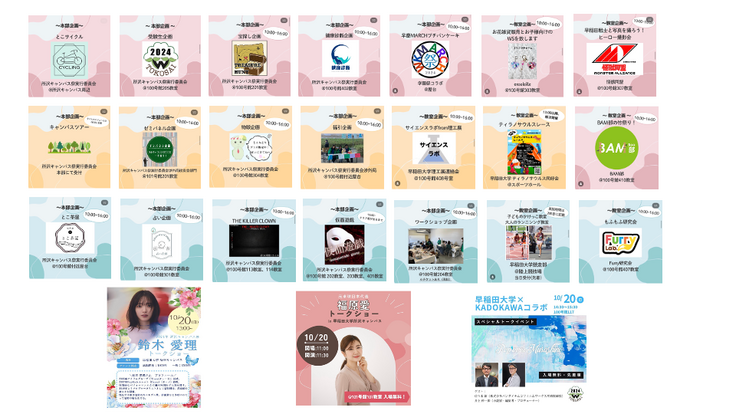所沢キャンパスならではの企画や、地元に根付いた企画、パフォーマンス企画等盛りだくさんです‼︎
