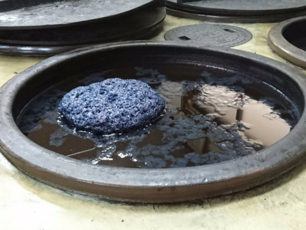 体験に使う藍は徳島の藍職人である矢野様に提供していただきます。いただく藍は古来からの天然灰汁発酵建の藍を使います。藍染の染め方には版画のように染める方法があります。私たちは安価で手ごろな糊付けで複雑なキャラクターの線や陰影を藍染で表現します。つまり、技術的に初心者の学生でも藍染でイラストを表現する事が可能です。
