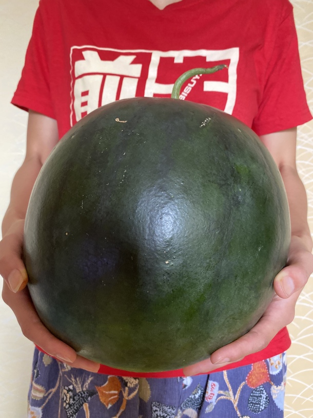 大島にある農産物直売所【ぶらっとハウス】で購入したスイカ(でんすけ)です。