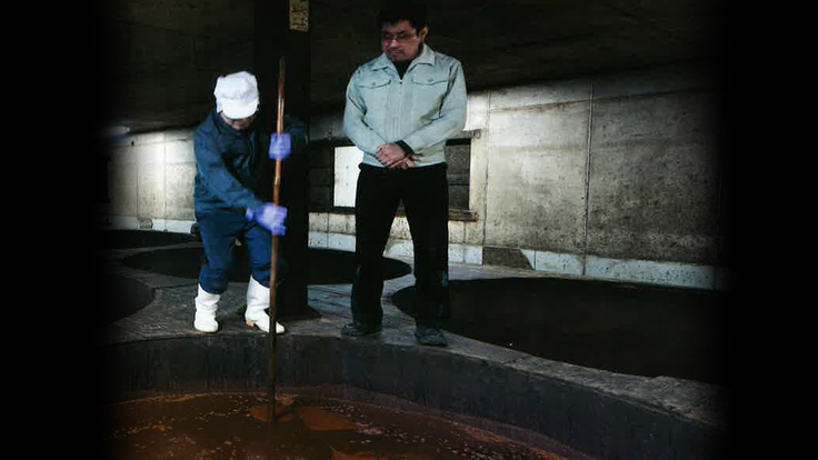 こだわりは昔ながらの製法です。土蔵造りの仕込み蔵と九尺の杉の木桶は、伝統と風格とともに、長い間に木に染み付いた微生物が複雑な味わいを生み出しています。
