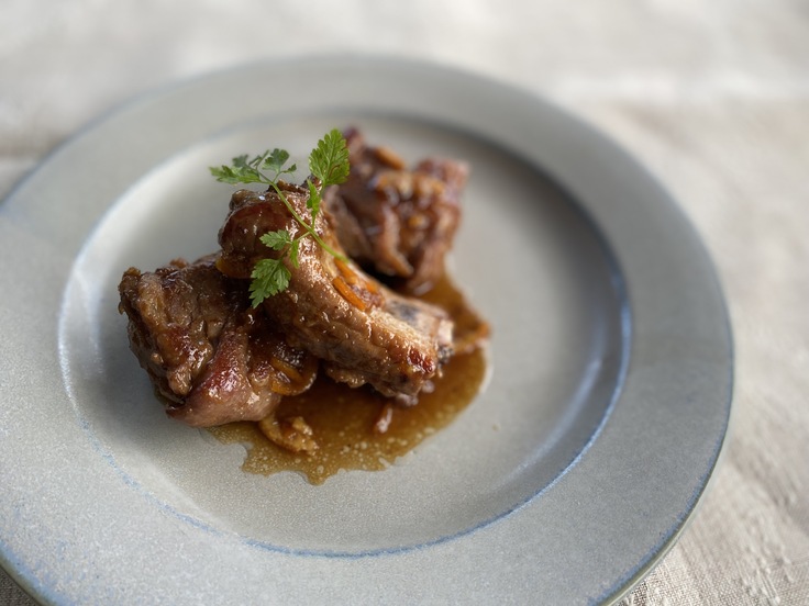 搾った後のもろみで作った「もろみ漬けスペアリブのオレンジマーマレード煮」