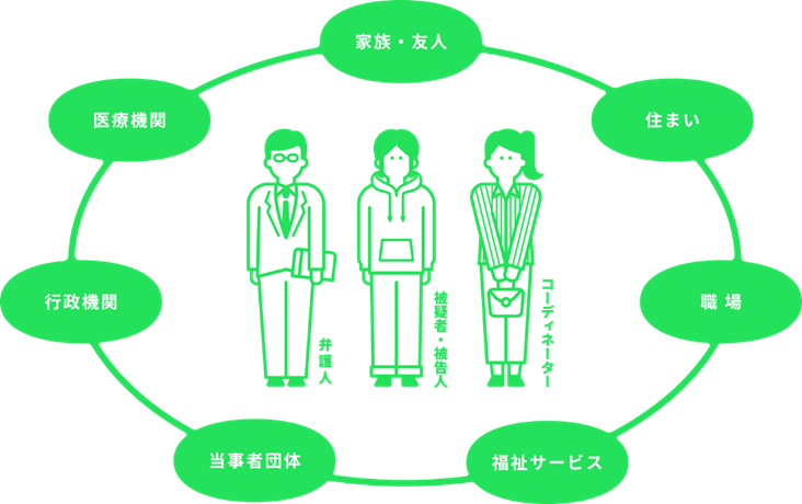 更生支援コーディネートは、弁護士からの依頼に基づいて行われます。弁護士は、刑事司法の立場から、処分・判決をゴールとして更生支援コーディネーターと協働します。しかし、更生支援コーディネートの観点からは、処分・判決はむしろスタートであり、その後の生活こそ、本人にとって重要なものとなります。