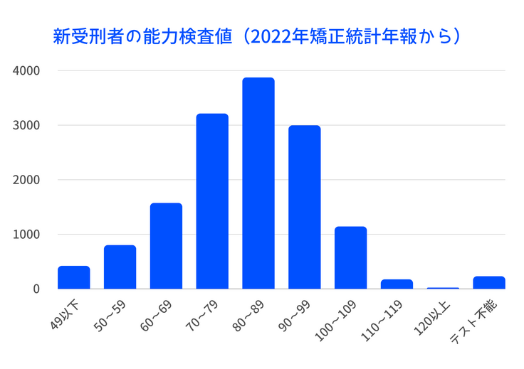 近年、刑務所等において知的障害のある人(または疑われる人)への処遇に関する関心が高まっています。下の図は、2022年の新受刑者の能力検査値をグラフにしたものです。能力検査値は、刑務所等で行われる検査によって、その人の能力や学力を測定した数値とされ、IQと類似するものです。この数値は100を頂点として正規分布を描くように設計されていますが、グラフを見ていただくとわかるように、実際には、頂点が「80~89」と全体的に低い数字にシフトしていることがわかります。もちろん、知的障害であるか否かはこの数値のみで測れるものではありませんが、この数字からは、多くの障害のある人が刑事手続におかれている現実が読み取れます。