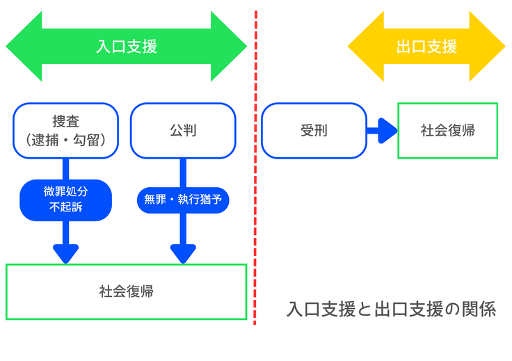 厚生労働省は、2009年より高齢・障害により支援を必要とする刑務所等を出所する人に対して福祉サービスにつなげる「地域生活定着支援センター」を整備しました。現在では47都道府県すべてに設置されています。この地域生活定着支援センターは当初、刑務所等を出所する段階、いわゆる刑事手続きの「出口段階」の人を対象として展開をしてきました。2021年度からは「被疑者等支援業務」として、被疑者・被告人段階、いわゆる刑事手続きの「入口段階」の人も対象とすることになりましたが、その対象はまだ限定的であり、こうした制度の枠に入らない方の支援ニーズは決して少なくありません。私たちの支援は、これらの制度には該当しない方への支援を含め、あらゆる罪に問われた障害のある人を対象に行っています(下の図を参照)。