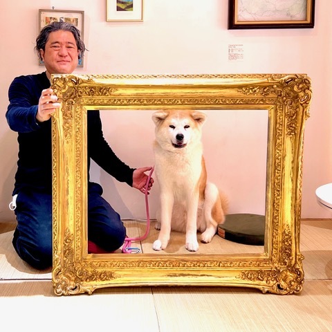 総合ディレクターでアーティストの中村政人と「やさしさ」について対話していただき、その方のために制作を始めます。神田の元額縁屋「優美堂」のどっしりと重厚で豪華、金縁の歴史的な額縁にキャンバスを張り描きます(写真の秋田犬を描くわけではありません(笑))。