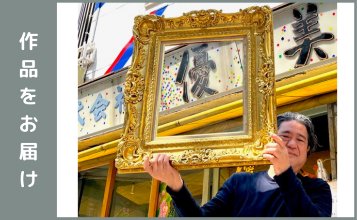 共同総合ディレクターでアーティストの中村政人が、ご支援者のために絵画を制作・お届けします。前回のビエンナーレでコミュニティアートスペースへと再生された神田の元額縁屋「優美堂」の額を活かし、「やさしさ」についての対話から制作を始めます。