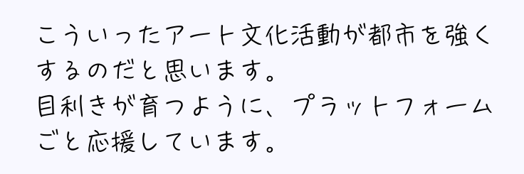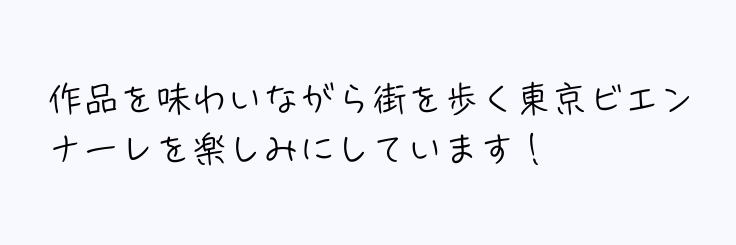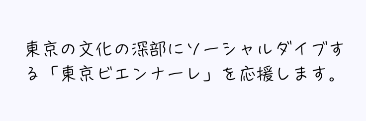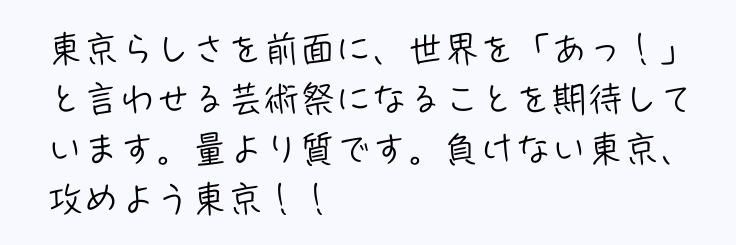 これら東京ビエンナーレの意義にご共感いただける方、東京を魅力的な場にしたい方、文化活動の活性化を願う方のご支援を、どうかよろしくお願いいたします。