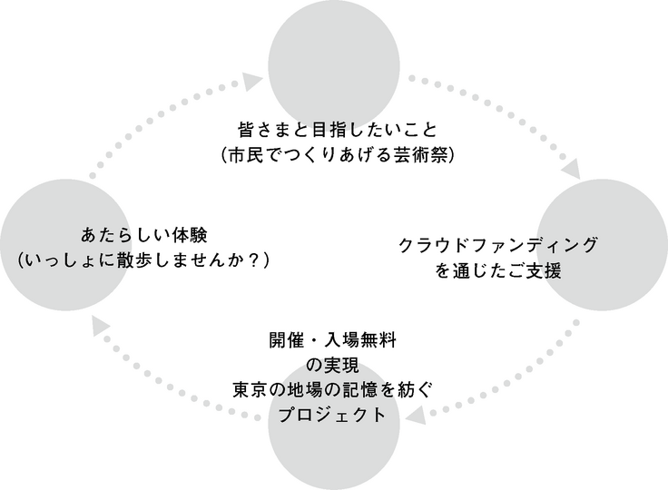 第1回、第2回とご支援いただいた皆様には引き続きのご支援を、そして3回目で初めてこのクラウドファンディングを知ったという方もあらためてご協力をお願いし、市民とともにつくる芸術祭という東京ビエンナーレの在り方を、今年も実現したいと願っています。