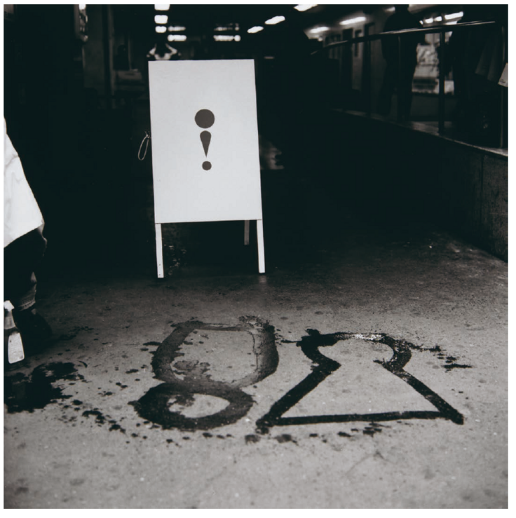 中村と村上、大阪展でのアクション。びっくりマークのような看板は、ハイレッドセンターのシンボルのマークから村上君が引用して制作。清掃のアクションをしている時に、小沢君がJIZOINGをぞうきんで描いたので、そこに私が鍵穴型を描き反応した瞬間。偶然にも記号としてのメッセージが三者のアクションとしてつながった時である。今思うと、現代美術の文脈と目の前の現実社会との狭間でもがいていたようにも思える。