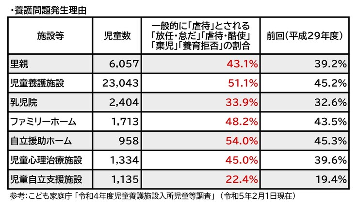 現在、2万3千人を超える子どもが児童養護施設で生活しています。入所の理由は様々ありますが、近年は「虐待」が増加傾向にあり、養護施設では半数以上の子どもがネグレクトや心理的・身体的虐待などを理由に入所しています。