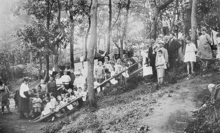 当時の福田会園庭斜面での孤児集合写真(所蔵:日本赤十字社)