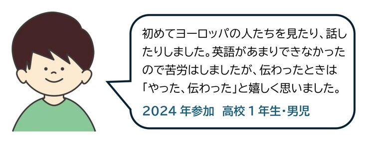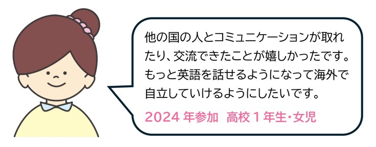 昨年参加した子どもからも、「もっと英語の勉強を頑張りたい」「留学をしてみたい」「海外で自立していけるようになりたい」といった声が出ており、海外での体験の効果がしっかり出ています。