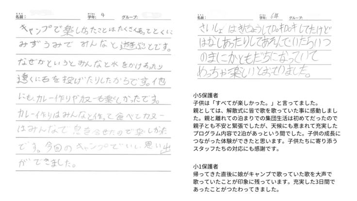 特に印象的だったのは、子どもたちはみんなと一緒にご飯を食べること、一緒にお風呂に入ることなど、プログラムだけではなくキャンプ生活そのものを楽しみにして満喫していたことです。仲間と一緒に生活できたこと、たくさんのお友達を作れたことが最大の思い出と語る子どもたちもたくさんいました。