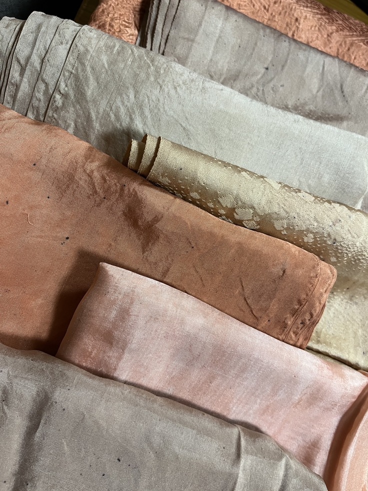 草木染ストールはシルクの反物を、メンバーが枇杷の葉や紅葉の葉で染め上げています。ぜひお手にとって自然のエネルギーを感じていただきたいです。