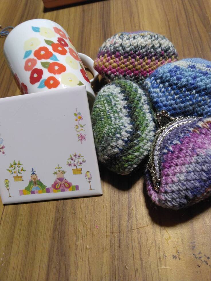 私はポーセラーツインストラクターで手芸が好きです。編み物は、10才からしています。かぎ針編みの がま口は、先日人生学園で講習した物です。