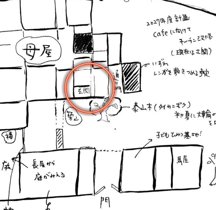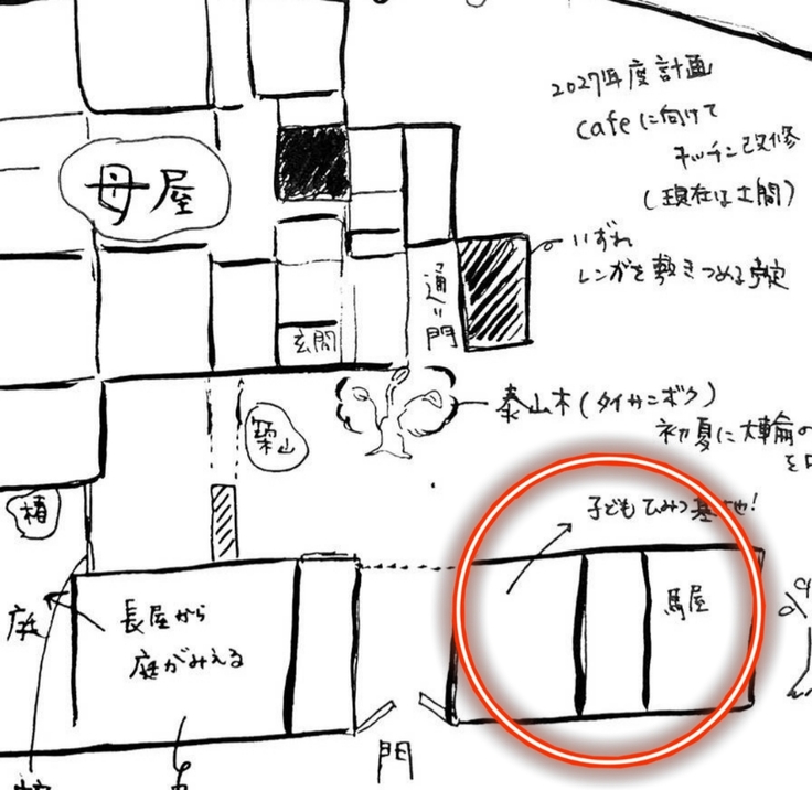 門をくぐると目の前には母屋が見えます。門長屋の左が今回改修を進めている長屋。そして右側が、この先「子ども秘密基地」としてDIYを計画している場所になります😊