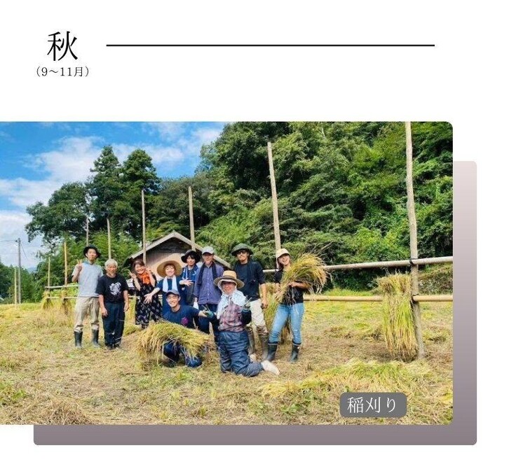 春に行った奥出雲町西田ファミリーの稲刈りです。現在ではほとんど見かけなくなった手仕事での稲刈り体験や、懐かしい"ハデ干し"をみんなで行います。