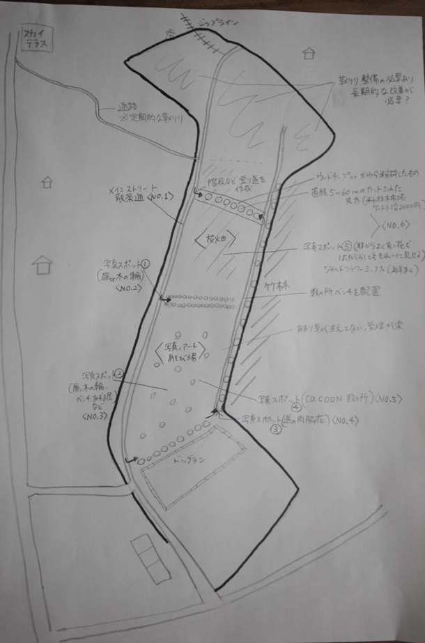 スペースには、トマシバへと繋がる谷を越えるジップライン(ターザン)、花畑、写真スポットなどにもなるくつろげる遊び場スペース、ドッグランなどなど。