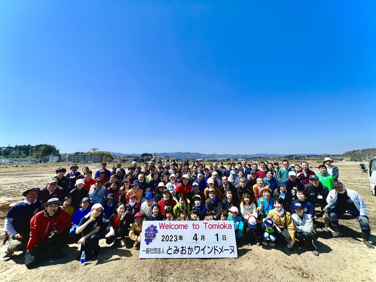 役場が帰還するちょうど1年前の2016年4月に富岡の地にワイン用ぶどうの苗木を植えつけました。富岡町民10名からのスタート。週末、皆異なる避難先から故郷・富岡町に集まり、故郷の再生の可能性を信じて必死に汗を流しました。