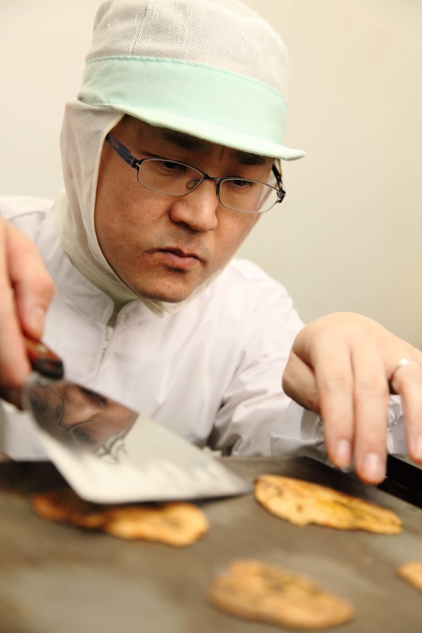 そこで、ほっき貝独特のその触感を残すために、その後いろいろな温度帯、プレス圧力に変化を与えていくと、ある温度で焼き上げると独特な旨みが凝縮しておいしいというを発見しました。そうして、固体ひとつひとつの肉厚と水分含有量に合わせた手焼きによる製法を編み出しました。