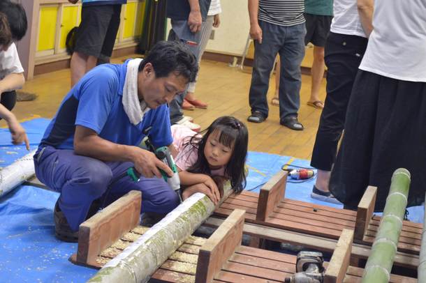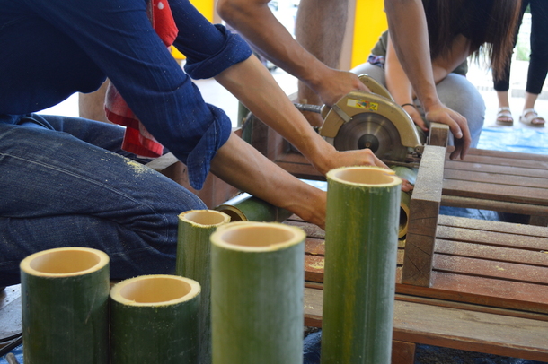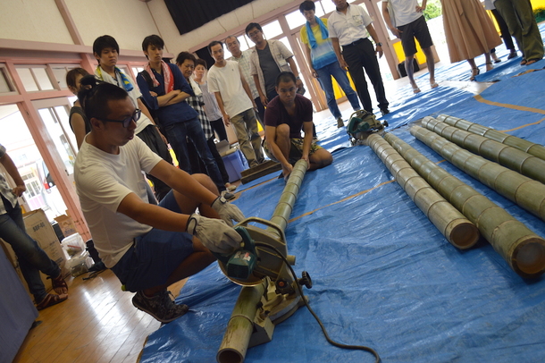 まちの旧保育所を使って、以前地元のかたが切ってきてくださった竹にデザイン通り穴を空けたり、大中小サイズに丸のこで切り落とす作業をしました。