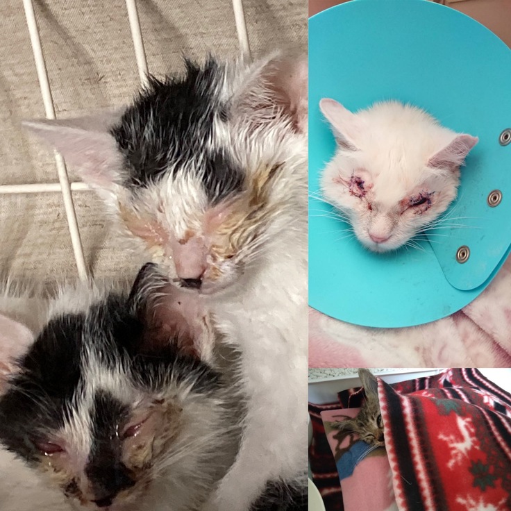 右の牛柄兄弟は3匹保護。酷い風邪で目がダメになるかもと言われました。口の中のベロから喉の奥まで皮がなく、真っ赤になり、食べることが出来ず、シリンジでゆっくりゆっくり食べさせて、何度も何度も注射に通い1ヶ月半かかって目が見えるまでになりました。