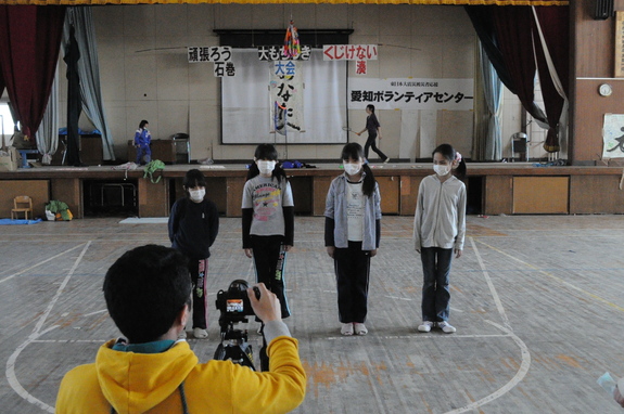 石巻市立湊小学校体育館にて、子供たちとともにコマ撮りアニメーションを作り、
