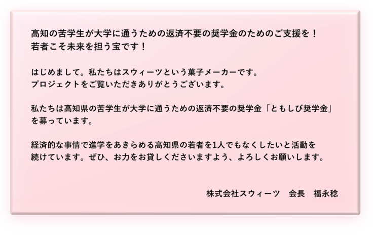 本プロジェクトは、㈱スウィーツが高知の苦学生を救うための返済不要の奨学金制度「ともしび奨学基金」を募集するプロジェクトです。集まった寄付金は全額、(株)スウィーツから(公財)土佐育英協会にお贈りし、高知の苦学生が大学に通う際の奨学金として使われます。事務経費も頂きません。月額3万円を4年間(累計144万円)、6年制大学は6年間(累計216万円)が学生に給付されます。現在、年に2人の奨学生に奨学金を給付していますが、今後、年に2人から5人にしたいという目標があります。安定的な寄付が実現できるよう年間1,000万円の寄付を目指す上で、まず、このクラウドファンディングに取り組みます。この取り組みを知らなかった方々にこのような奨学金制度があるということを知っていただき、同時に、大学進学を考える学生さんやその親御さんに高知県で唯一の返済不要の奨学金「ともしび奨学基金」があるということをお伝えしていきたいので、ぜひ、お力をお貸しください。よろしくお願いします。