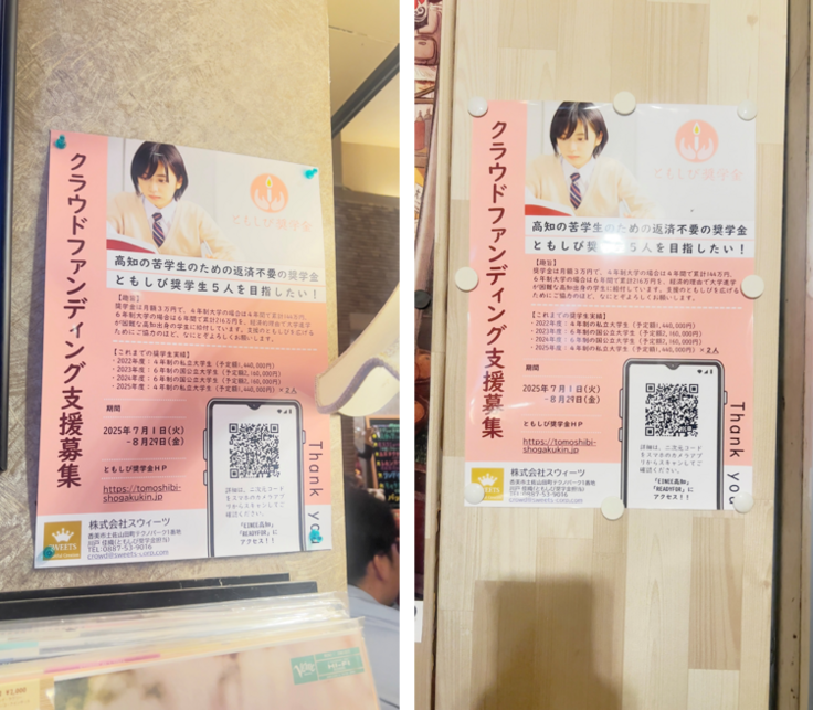 ともしび奨学金クラウドファンディングの期間中、高知市のラウンジ・セヴレさんにポスター掲示のご協力をいただいていました。