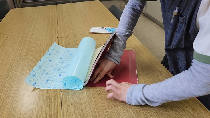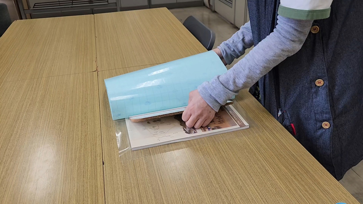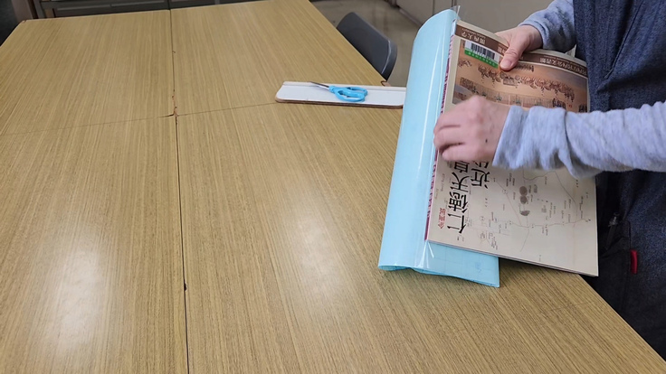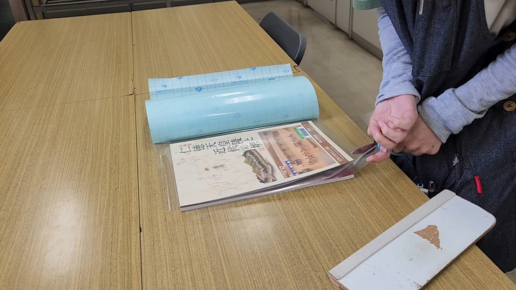 図書館で行う「装備」とは、資料の管理や保存をするための作業のことです。このリターンでは、その「装備」の作業の中でも、大切な資料を保護するための、フィルムでカバーをする工程を体験していただきます。