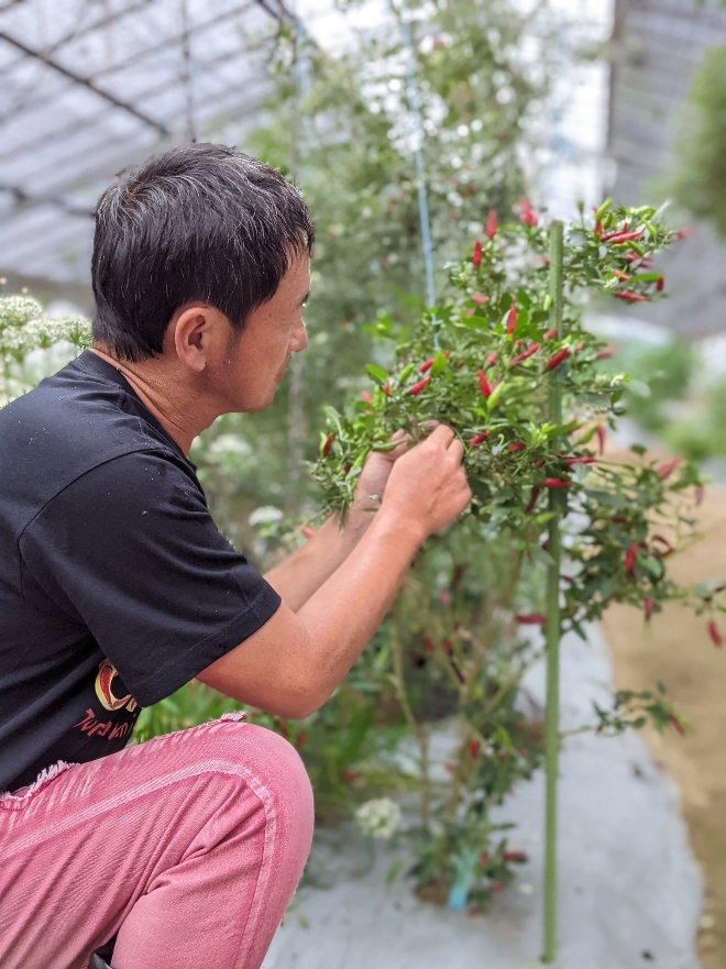 初夏には唐辛子苗約100品種の販売と前職の三輪素麺の企業で学んだ乾燥技術を応用した一味とうがらしを通年で販売させて頂いております。