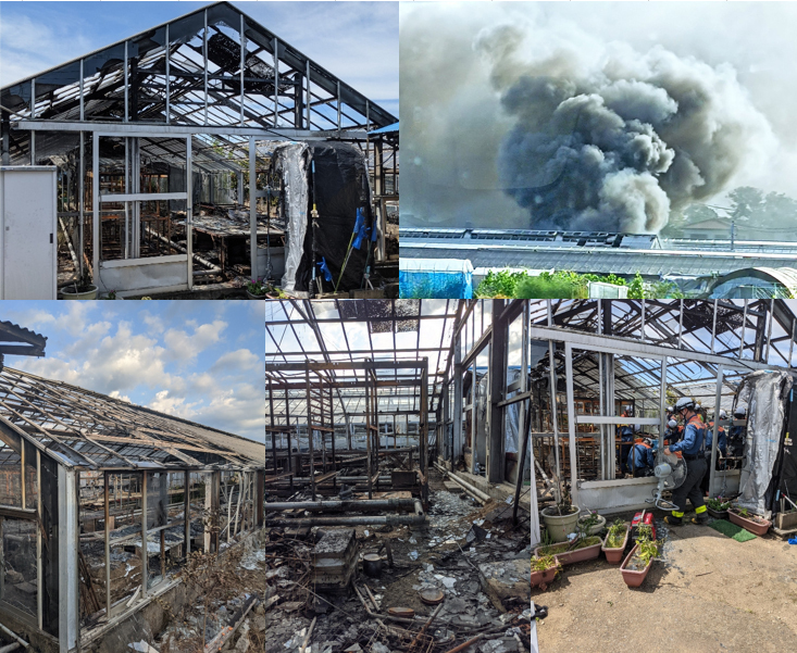 20台以上の消防車で渋滞する中でどうにか仕事場に到着した時には消防隊員の方々のおかげですでに鎮火していましたが、最も重要な施設であるガラス温室が見るに堪えない悲惨な光景となっておりました。