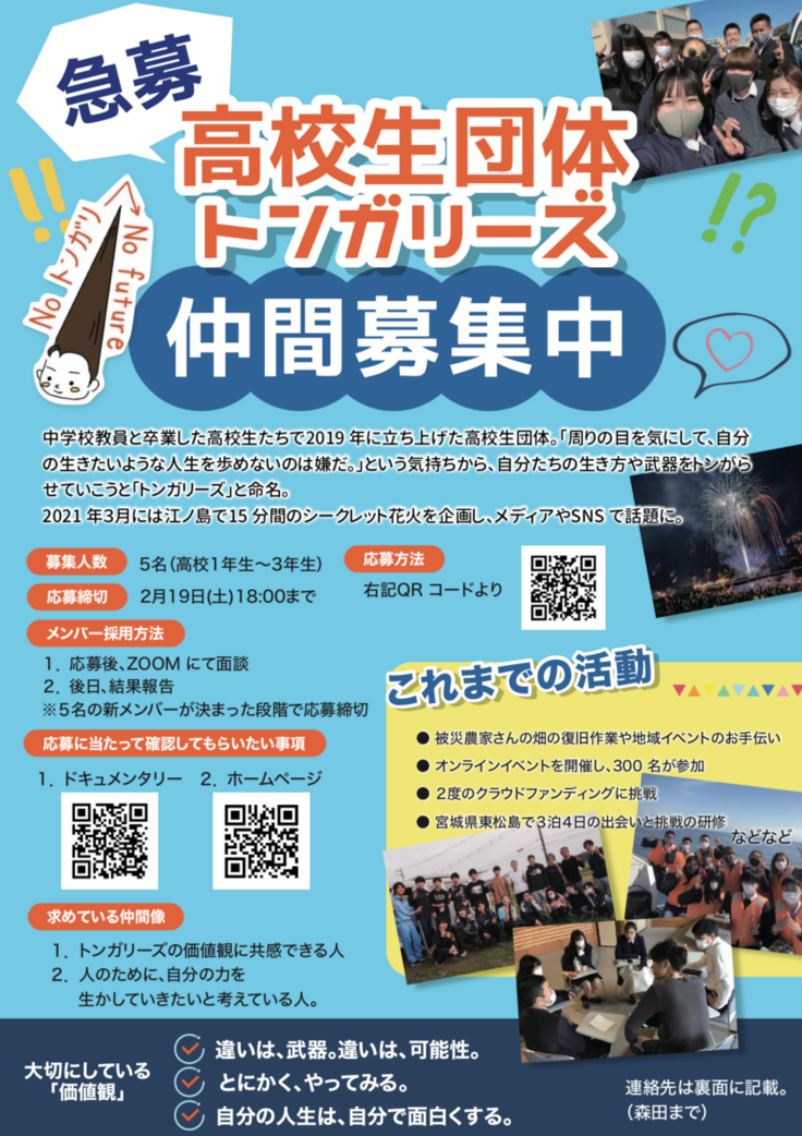 トンガリーズの価値観にフィットする高校生が、自分のやりたいことを、誰かを笑顔にするためにアクションを起こせる場になれば良いなと思っています。