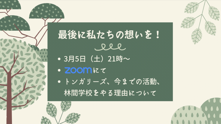 3月5日にトンガリーズがこの林間学校にかける想いをぜひ聞きにきてください!!ご参加お待ちしております。