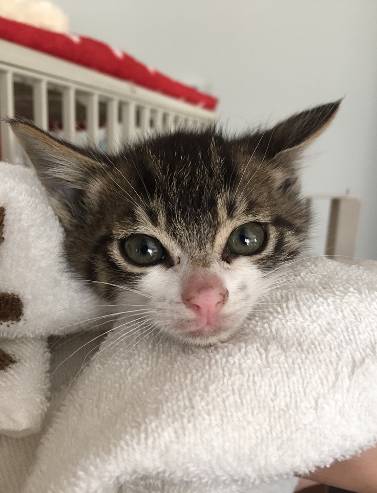 自宅近所の駐車場にて、子猫の鳴き声が聞こえ確認してみると1台の車のボンネットから聞こえ、なんとか所有者の方にボンネットを開けて頂き、生後1カ月ほどの子猫を保護しました。